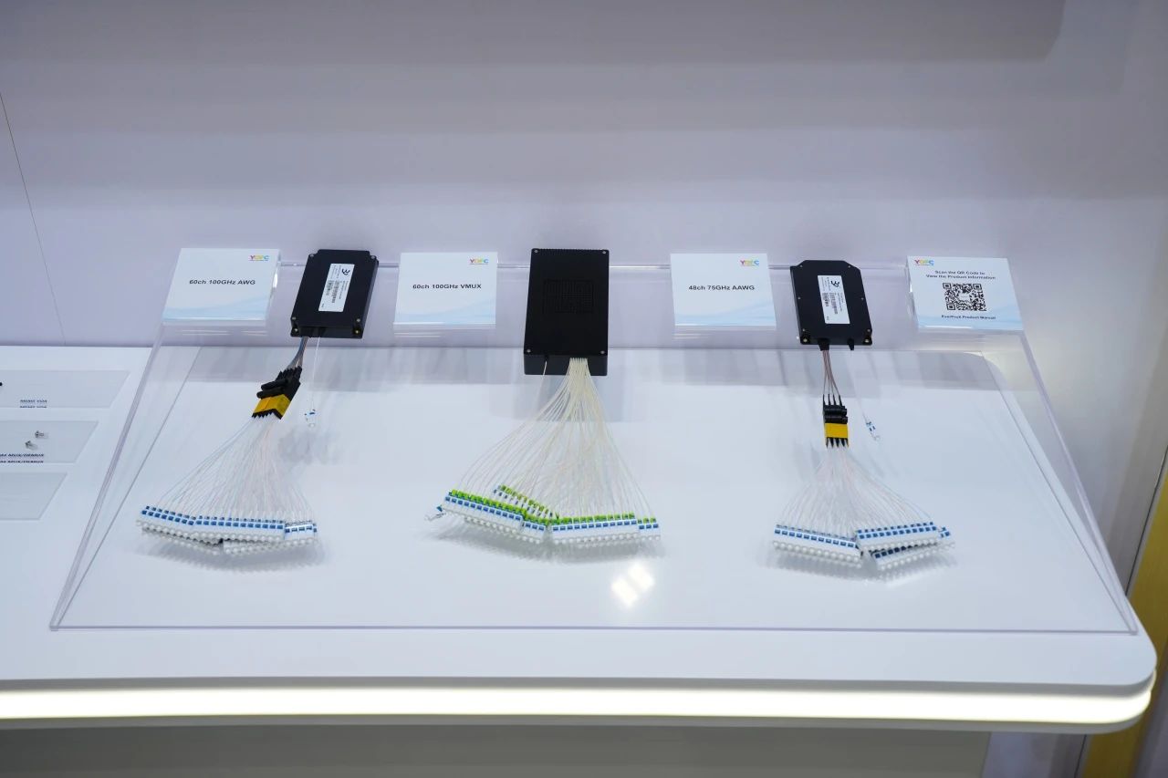 在无源光器件展区,长飞公司展示了旗下长芯博创的系列无源光器件产品,包括波分复用的阵列波导光栅(AWG)、可调光功率波分复用器(VMUX)、可调光衰减器(VOA)、光纤阵列(Fiber Array)等,其产品质量超越行业各类标准及严苛质量要求,以技术实力与品质保障赋能光通信发展。