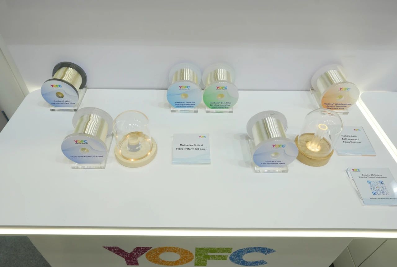 在下一代新型光纤展区,长飞公司展示了行业领先的空芯光纤、多芯光纤、超低衰减大有效面积G.654.E光纤以及OM4/OM5高端多模光纤,为下一代光网络提供超低损耗、超低时延、超大容量“运力”介质,助力全球数字基础设施演进升级。