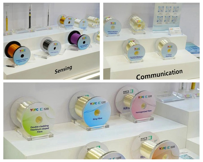 在特种光纤光缆展区,长飞公司展示了用于通信领域的覆盖630~1550nm全波段器件保偏光纤、掺铒/铒镱共掺等系列有源光纤,用于传感领域的耐高温光纤光缆、碳涂覆光纤、抗辐照光缆、油井传感光缆等产品,以及用于工业激光领域的双包层掺镱光纤、环形光纤、匀化光纤、紫外光纤等产品,满足客户多样化需求。