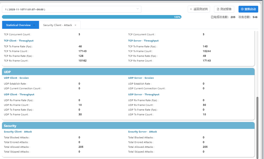 • 测试执行阶段,平台实时监控测试进度,统计详细的测试数据和防护日志。通过精密的流量控制机制,确保测试流量的准确性和可重复性。