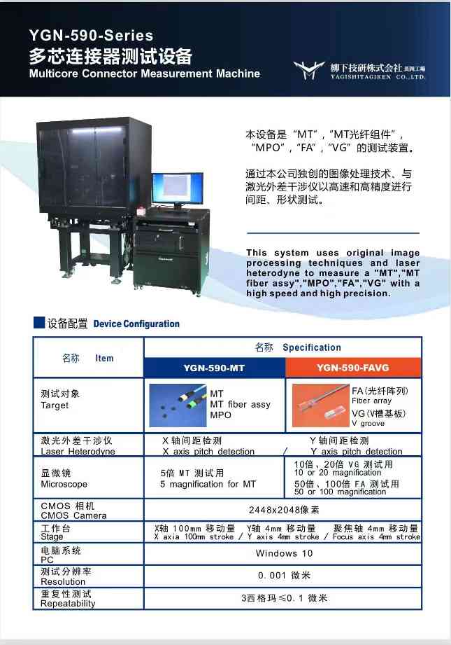 在AI驱动800G/1.6T高速光模块的需求下,柳下技研凭借在光通信与半导体精密测量领域多年的技术积累,开发出YGN-590系列产品,可全面支持FA(光纤阵列)、VG(V槽基板)、MT、MPO等主流光通信组件。