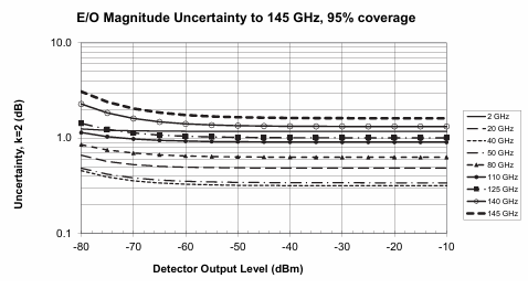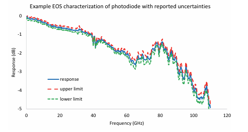 一个简单的例子是表征145 GHz的EO调制器。在这个频率范围内有一个以EOS为特征的光电二极管,EOS数据将用于去嵌入。首先,使用0.8mm同轴校准套件校准VNA(安立ME7838D)。我们预计较高信号电平的传输不确定性为0.1-0.2 dB,该仪器的噪声基底在大部分频率范围内为-100至-110 dBm。在这种情况下,与图6不同,光电二极管表征的不确定性在30 GHz以下最高(低端增加到1 dB),在较高频率下平均为0.4 dB。