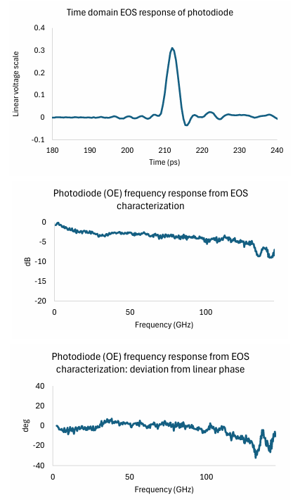 需要对其中一个转换器件进行高质量的表征,以便能够解决另一个问题。这个过程可以从任何一侧开始,但在这里我们使用光电探测器作为基础,因为它随时间的稳定性更容易量化,偏置依赖性通常较弱。基础表征通常使用电光采样(EOS)进行,其中使用非常窄的光脉冲(飞秒级,与光电二极管的预期皮秒级脉冲响应相比)来激发光电二极管,并对光电二极管的输出脉冲进行时间分析。通过该输出脉冲的变换,可以获得光电二极管的频率响应。图3显示了用EOS流程获得的145 GHz光电二极管的示例脉冲和频率响应曲线。值得注意的是,频率响应曲线并非完全单调。在内部,光电二极管在射频侧(包括射频连接器)和有源区域本身有多个失配中心,这可能会导致轻微的纹波。重要的是,这种频率响应结构在时间上是稳定的,因此该器件可以作为传输标准。同样值得注意的是,频率响应的相位也被提取出来,这对于评估通过感兴趣的路径或器件的群延迟失真非常有用。全相位函数将具有与器件电长度相对应的陡峭斜率,主要关注的是与线性斜率的偏差,该偏差如图3所示。