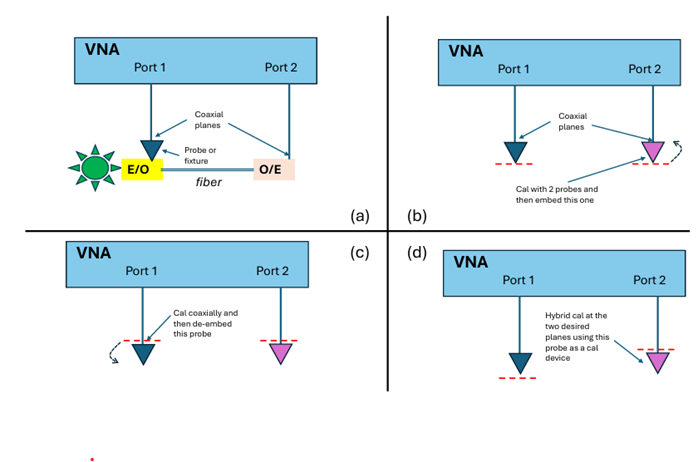 随着光学系统集成水平的提高(包括硅光子学的流行领域),这种类型的测量通常包括混合介质(例如,一个端口在晶圆上探测,另一个端口可以是固定的或同轴的)。这种设置的草图如图11a所示。不仅光学工程更复杂,毫米波校准和去嵌入也更具挑战性,可能会增加不确定性。