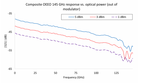 如图5所示,在三个光功率水平下的复合EO-OE测量中可以看到这一结果。即使曲线形状不变,它们也更接近VNA噪声基底(在这个尺度上标称为-110 dB),因此在这个例子中,在-25 dBm的光功率下,dB尺度的影响是可能的。降低VNA测量的中频带宽、使用接入环路(以减少接收机的损耗)或增加射频功率(直到VNA或EO系统的线性受到挑战)都是缓解这种情况的手段。最高频率结构的变化是由于这种设置中的非线性。