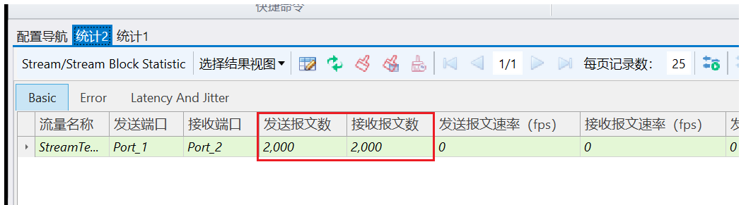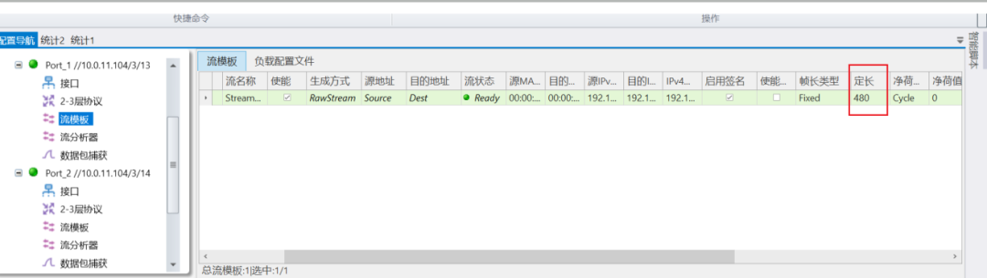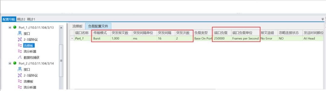 在1G端口的端口模式下创建一条480 Bytes线速突发流量,打4 ms,停16 ms(突发间隔),发送2次突发流。