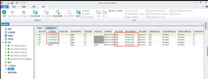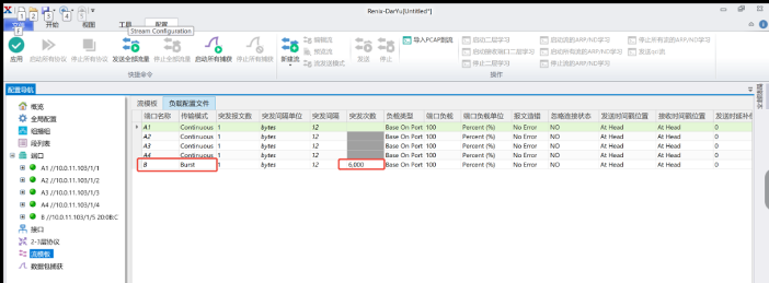 3. 配置测试仪表与板卡B相连的端口的数据流,使其发送Burst流量(包长1000bytes),Burst流量均匀发送给测试板卡A的m个端口,并且Burst流量的总字节数=板卡的缓存大小。