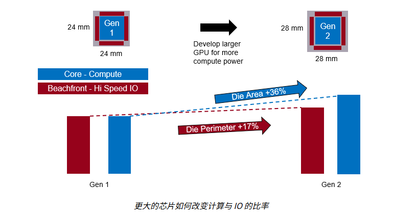对更高速带宽的迫切需求,直接源于 GPU 本身的演进及其与芯片机械结构之间的关系。随着算力需求不断膨胀,为了塞进更多计算电路,GPU 的芯片尺寸被推向极限,在某些情况下已达到约 800 mm2 的光罩极限尺寸。如今,GPU 更是以成千上万、乃至数万颗的规模组成集群,这意味着巨量数据必须通过位于芯片四周——即所谓“beachfront”——的高速 IO 接口流出芯片。问题随之而来:当芯片面积增大时,计算资源随面积成比例增长,而高速 IO 资源却只能沿着周长增加,这就是著名的 beachfront 瓶颈。