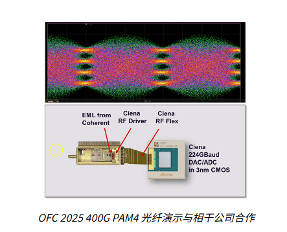 1.Ciena 在OFC 2025的现场发射端光学演示展示了400G PAM4 数据眼图,该演示由Ciena与 Coherent 合作完成,Coherent提供了电吸收调制激光器(EML)。EML 历来是每一代数据中心网络新速率节点最早部署的激光器,并且至今仍是当今运行中的绝大多数单模链路的中坚力量。此次展示 448G Tx 技术(包括 DSP 发射机与 EML)是带动整个生态向上迈出的关键一步。