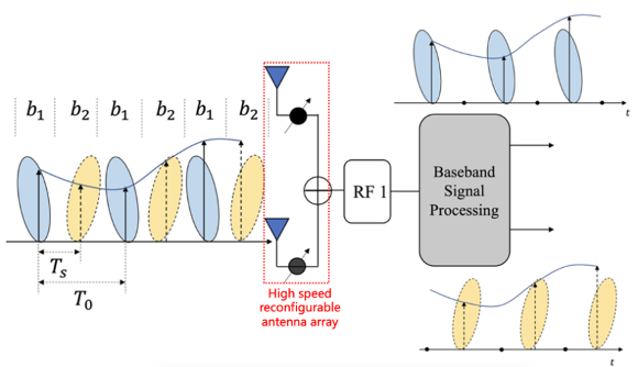 针对上述问题,论文首次提出了Pseudo MIMO(超维MIMO,pMIMO)技术的数学模型与收发机联合优化理论。作为一种接收端增强数模混合MIMO技术,pMIMO的核心创新在于引入采样点级高速可重构天线阵列,使其能够在一个OFDM符号周期内动态切换多种接收波束。通过对接收信号进行空时联合处理,该技术突破了传统MIMO系统中“并行数据流数受限于射频通道数”的瓶颈,从而在不增加射频通道数的前提下,支持更多并行传输流数,显著提升系统频谱与能量效率。