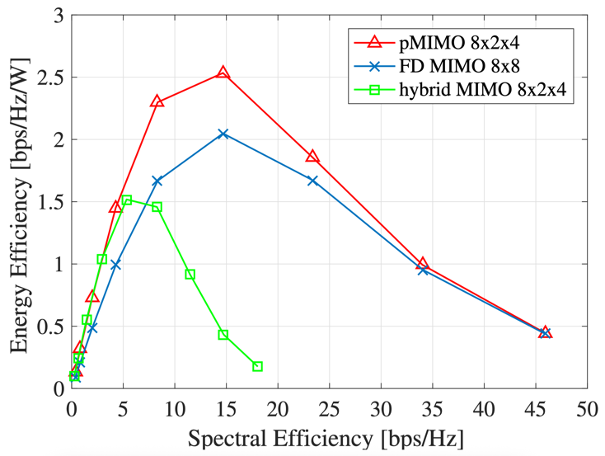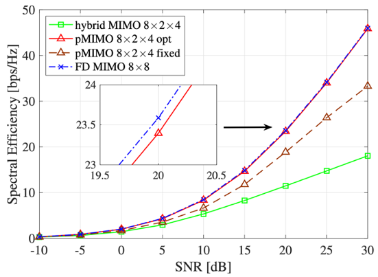 论文基于矩阵理论,创新构建了pMIMO系统的等效信道模型,从数学理论层面揭示了其突破MIMO流数瓶颈的核心机理。结合6G系统设计,研究进一步提出了面向pMIMO的收发机联合优化理论,建立了发射端预编码与接收端模拟波束赋形之间的协同优化机制,并在实际硬件功耗约束条件下,设计了能够最大化系统频谱效率的低复杂度联合优化方案。仿真结果表明:相比传统数模混合MIMO技术,所提技术在硬件复杂度和功耗基本不变的前提下,频谱效率显著提升达60%;与全数字MIMO技术相比,在实现相近频谱效率的前提下,硬件成本和能耗降低30%。同时,所提算法在典型配置下的迭代收敛次数不超过十次,兼具高效性与实用性,为pMIMO系统在6G中的工程化落地提供了理论与算法支撑。