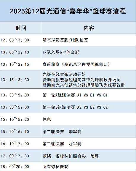 第12届“光通信运动嘉年华”篮球赛共招募全国光通信6个球队,分别为毅宏联队,深圳光聚队,武汉BBA队,华东光通联队,中广核队,EFTACK联队,让我们共同期待这场光通信体育盛宴的到来。希望各位参赛选手能够发扬拼搏精神,赛出风格、赛出水平;同时也欢迎广大行业同仁前来观战助威,共同见证这一精彩时刻。除了工作,运动也是生活的重要部分,篮球赛的规则及参赛选手名单现已正式公布。