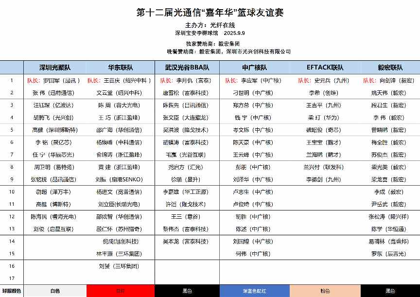 球赛为行业友谊赛,所有球员名单必须来自光通信行业从业者,以下为本届篮球赛名单,公开如下,各球队一旦确认名单后不得随意更换: