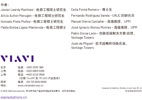 使用 VIAVI OneAdvisor 800 测试仪进行现场测量。这种测试仪安装在无人机上,能够移动到基站周围的各个兴趣点进行原位测量。该测试仪可以将频谱划分为不同的频段,从而通过为每种类型的蜂窝传输选择相关的频段来测量不同的技术,如 3G、4G LTE 或 5G NR。