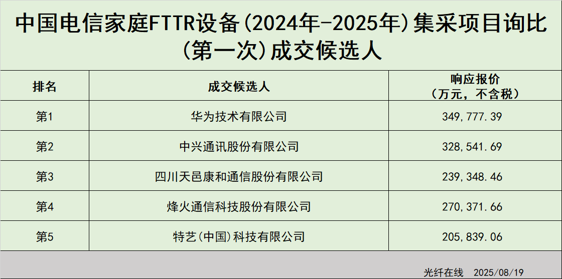 对比两次采购成交候选人的报价,在第一次采购中,五家的报价相差还非常大的,从20多亿到35亿,中间相差了近15亿,而这一次几家的报价已经比较接近,都在20亿左右,这种价格趋同现象,也说明FTTR市场已逐步趋于稳定了。