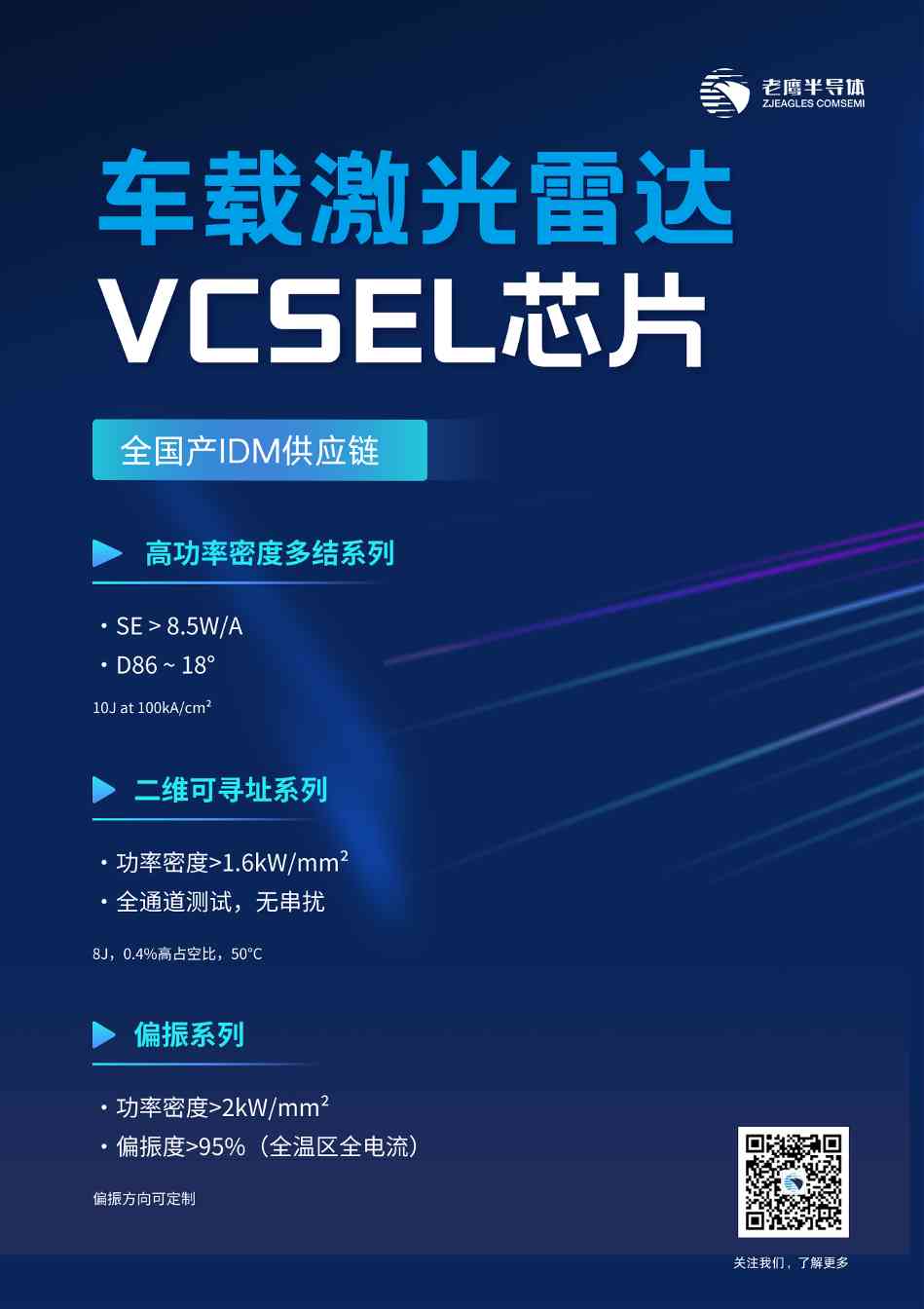 老鹰半导体持续致力于技术创新和产品研发,以满足不断变化的市场需求。在展示单波100G VCSEL芯片、9/10结车载雷达芯片、二维可寻址多结VCSEL芯片的同时,老鹰半导体还将携数据通信系列单波100G PD芯片,激光雷达系列偏振VCSEL芯片等多款实力产品,在全面赋能算力互连、智能驾驶、智能感知等应用领域的同时,与现场观众共同探索更多元的应用场景。