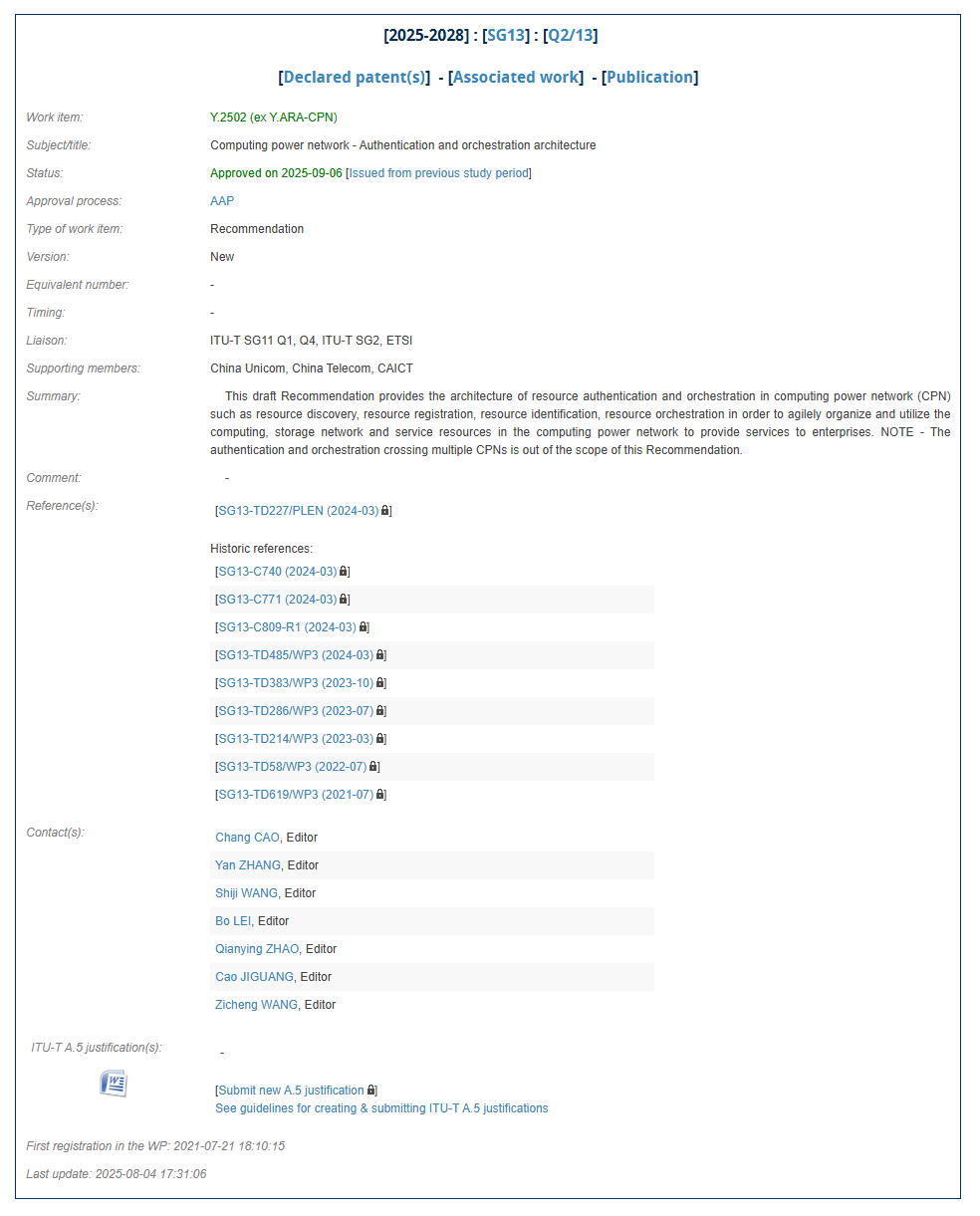 算力网络的核心价值在于打破计算、存储、网络资源的孤岛效应,实现跨域、异构资源的敏捷组织与优化利用。然而,多资源提供商共存、多管理机制并行、资源状态动态变化等特性,对资源合法性验证、高效调度编排提出了严峻挑战。ITU-T国际标准Y.2502历经四年的技术研讨、方案迭代与细节打磨,最终于2025年9月达成共识并获得发布批准。作为首个聚焦算力网络资源认证与编排的国际标准,ITU-TY.2502明确了算力网络资源认证与编排的整体架构,涵盖CPN编排层、CPN资源层、CPN服务层等核心功能,定义了资源发现、注册、认证、编排、信息获取全流程服务逻辑,为不同厂商、不同类型资源协同提供了通用参考框架。