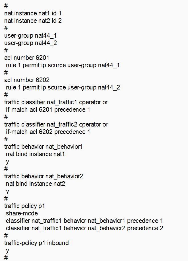 UP侧配置两个NAT实例,port-range为1600,每个实例配置1024个公网地址,分别对应Bras业务板上下子卡的各10个用户接入端口;CP侧配置相应NAT实例、user-group、acl、cb对、上线域等。关键配置如下: