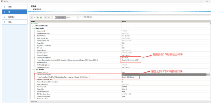 下行流量构建需创建raw流,目的IP覆盖所有公网IP,目的端口跳变覆盖所有端口块,注意公网IP跳变与目的端口跳变关联,否则覆盖不到所有的端口块: