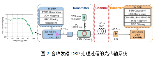 瑞典皇家理工学院的Li Dan等研究人员面向强度调制和直接检测(IM/DD)系统,应用卷积神经网络-门控循环单元(CNN-GRU)和双向长短期记忆网络(BiL STM)两种神经网络均衡器在一定程度上克服了使用环形谐振器调制器(RRM)带来的信号非线性损伤,如图2所示[2]。研究人员采用42 GHz带宽的RRM(驱动电压为2.7Vpp)实现了神经网络均衡过程。研究结表明:该方案实现了最高达256GBaud符号速率开关键控调制;当测试信号经由100米单模光纤传输后,其比特误码率可实现低于7%开销的硬判前向纠错阈值。综上所述,该类神经网络均衡器的应用可为高符号IM/DD系统有效收发及传输信号提供有力支持。