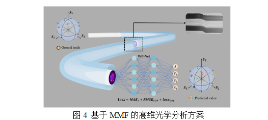 华中科技大学的Yuxuan Xiong等研究人员针对传统光谱仪和旋光仪同时测量波长和偏振态将导致空间、时间效率降低的问题设计了基于多模光纤(MMF)的高维光分析仪,如图4所示[4]。该装置能同时高精度测量波长和偏振态(SOP),解决了传统光谱仪和偏振仪无法同步测量多参数的问题。研究人员利用MMF对输入光的敏感性,通过光纤输出端的散斑图案变化反演波长和SOP信息;并引入了纤芯偏移拼接技术以增强模式耦合和灵敏度;且设计了名为WP-Net的神经网络来实现波长和SOP的同步测量;还通过将光学先验知识融入损失函数优化了系统接收信号的灵敏度和预测精度。研究结果表明:应用该方案可实现0.045pm波长精度和 0.0088 SOP精度的测量,相比传统方案分别提升47.06%的波长精度和36.23%的SOP精度。因为构建的该装置结构紧凑、成本低廉且具备高时空效率,未来有望应用于光通信、光学成像和光电传感等多领域。