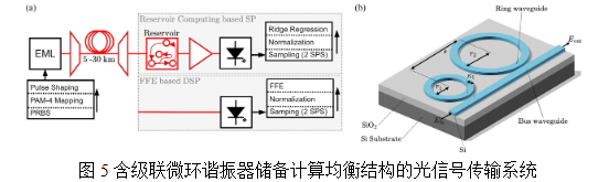 英国基尔大学的Sebastian Kühl等研究人员设计了应用于级联微环谐振器的光学储备计算结构,用于实现短距离收发PAM-4信号的光学均衡过程,如图5所示[5]。他们在硅基光子集成电路中引入了两个级联微环谐振器,并对112GBd符号速率下O波段波分复用传输系统进行了数值模拟仿真研究。在实验过程中,研究人员进行了基于耦合模理论的非线性建模与参数优化,比较了该结构与传统前向均衡(FFE)DSP在相同计算复杂度下的性能。研究结果表明:应用该方案能使接收信号的误码率降低一个数量级,可明显提高信号的色散容限和传输距离,同时对接收光功率和制造偏差具有高鲁棒性。综上所述,应用该装置在降低功耗和计算复杂度的同时可在短距离高速光传输系统中实现高效信号均衡过程,展示了其在未来光互连领域中的应用潜力。