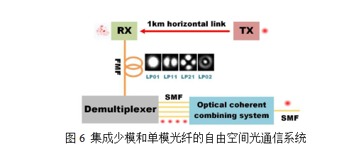 深圳大学的Ming Zhang等研究人员设计了结合模态解复用与相干光束合成的新型自由空间光通信系统,用于在大气湍流环境中实现稳定的卫星到地面(及近地)通信过程,如图6所示[6]。他们采用少模光纤将经大气湍流影响后的自由空间光信号输入,通过模态解复用器将LP01、LP11、LP21和LP02模式分别转换为单模,且利用含压电陶瓷控制的光纤型相干合成系统以实现多路信号的相干叠加。研究人员构建1km城市通信链路,并在发射端输出功率25dBm的光信号,在接收端实现了20Gbps QPSK传输信号的有效接收(误码率低于10⁻⁶),且长期运行中无明显信号衰落或功率波动。研究结果表明:该方案兼具少模光纤高耦合效率与单模光纤高速传输优势,相较于自适应光学等抵抗大气湍流影响具有结构简单、稳定性高和易于建设等应用优势。综上所述,该方案为复杂大气环境下的自由空间光信号高速稳定传输提供了参考借鉴。
