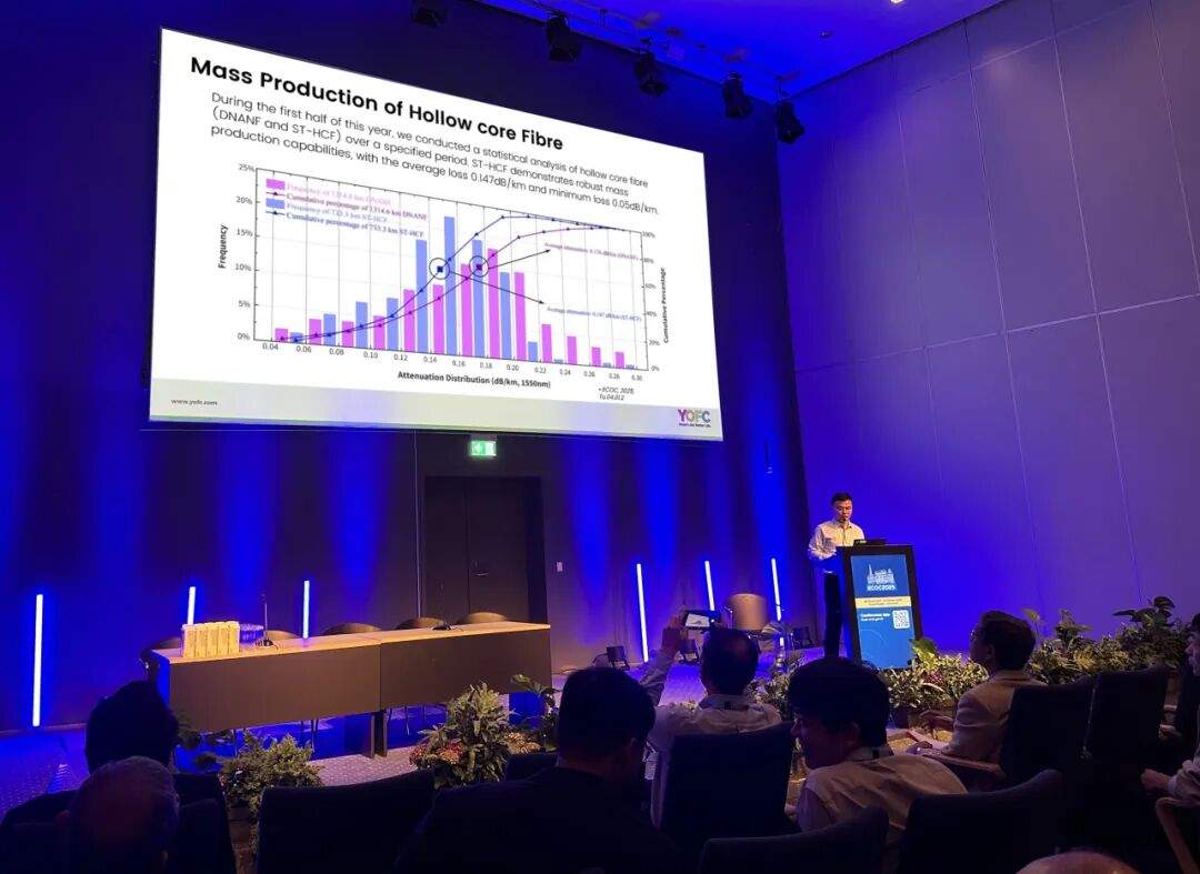 在“What type of optical fibre will be deployed, When and Where?”专题研讨会上,李鹏发表了题为“Hollow Core Fibres:From Laboratory Innovations to Practical Applications”的演讲,与业界同仁探讨了空芯光纤的低损耗和长距离制备技术。