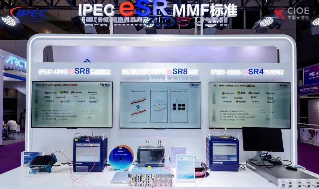 光博会现场,IPEC联合10余家会员单位打造的“eSR多厂家光模块互通演示区”,成为人气旺盛的展会焦点之一。现场通过400G eSR4@150m、400G eSR8@200m两大核心场景的实景测试,完成过长纤误码测试、FEC压力测试以及交换机蛇形流量测试等一系列严苛验证,端到端稳定运行,证明了标准的技术稳定性与跨厂商兼容能力。