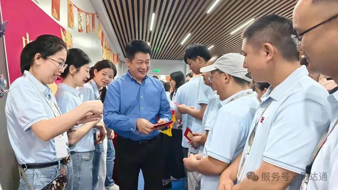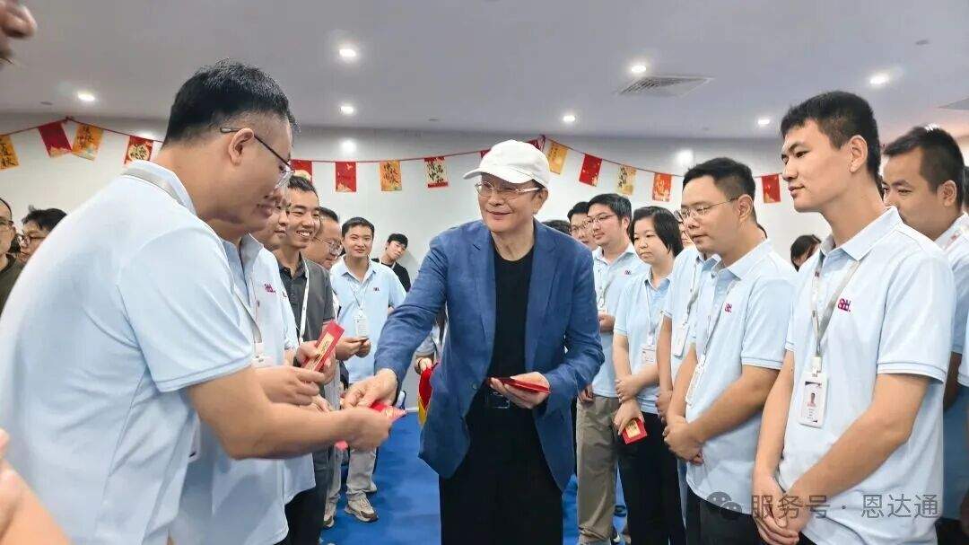 致辞结束后,庆典活动迎来了高潮——董事长带领公司高管亲手派送节日慰问红包。顾董携同管理层亲手将一份份承载着感谢与祝福的红包递到每一位员工手中,并与大家亲切交流、合影留念。现场掌声雷动,笑声不断,红色的信封映照着每位员工喜悦的脸庞,不仅传递了公司对员工辛勤工作的实质性回报,更体现了恩达通大家庭以人为本的企业文化理念。