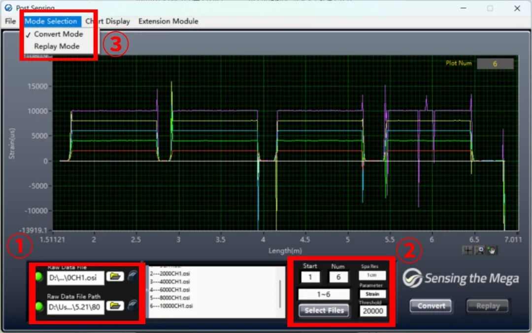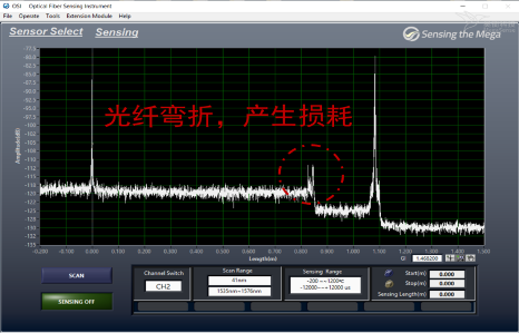 打开OSI-S软件,点击SCAN出现OFDR曲线,若以当前状态为参考进行测试,①设置传感段长度②设置参考保存位置③保存参考。