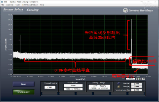 如下图1所示为正常OFDR曲线,参考曲线笔直、平滑,尾端反射与参考曲线差值在35dB以内,并且底噪信号与参考曲线差值大于8dB,曲线长度与实际长度相同。