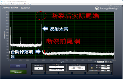 光纤断裂后曲线,会出现测试长度与实际长度不符,断裂处出现高反射。