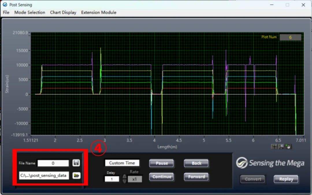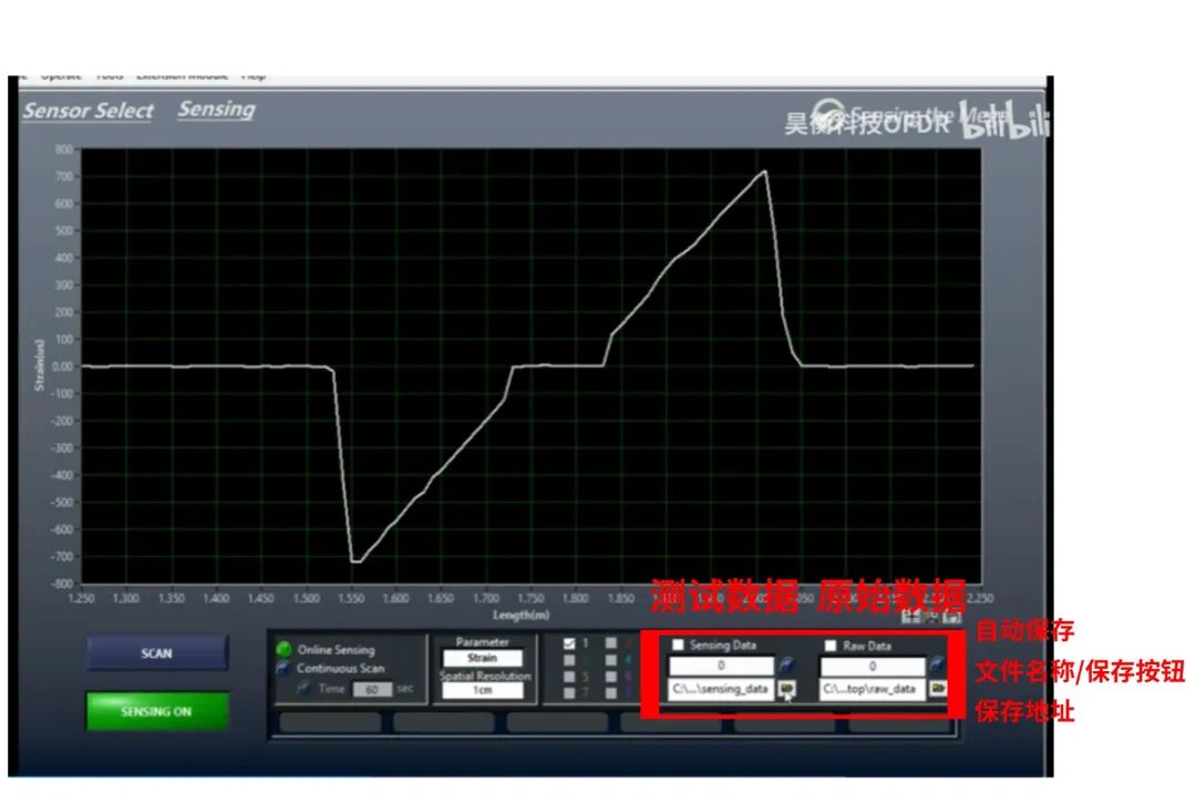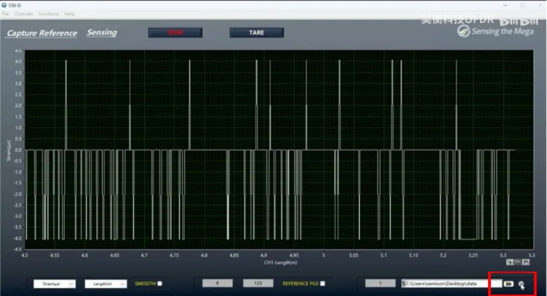 打开OSI-D软件,设置通道数、长度和模式,点击SCAN出现OFDR曲线,设置传感段和空间分辨率后再次点击Scan完成参数设置,点击Sensing进入传感界面,点击Start后软件将自动保存参考至桌面Data文件夹中,如有多组参考文件需要保存,记得每次保存一组参考文件后及时拷贝留存,避免下次保存参考时覆盖数据。