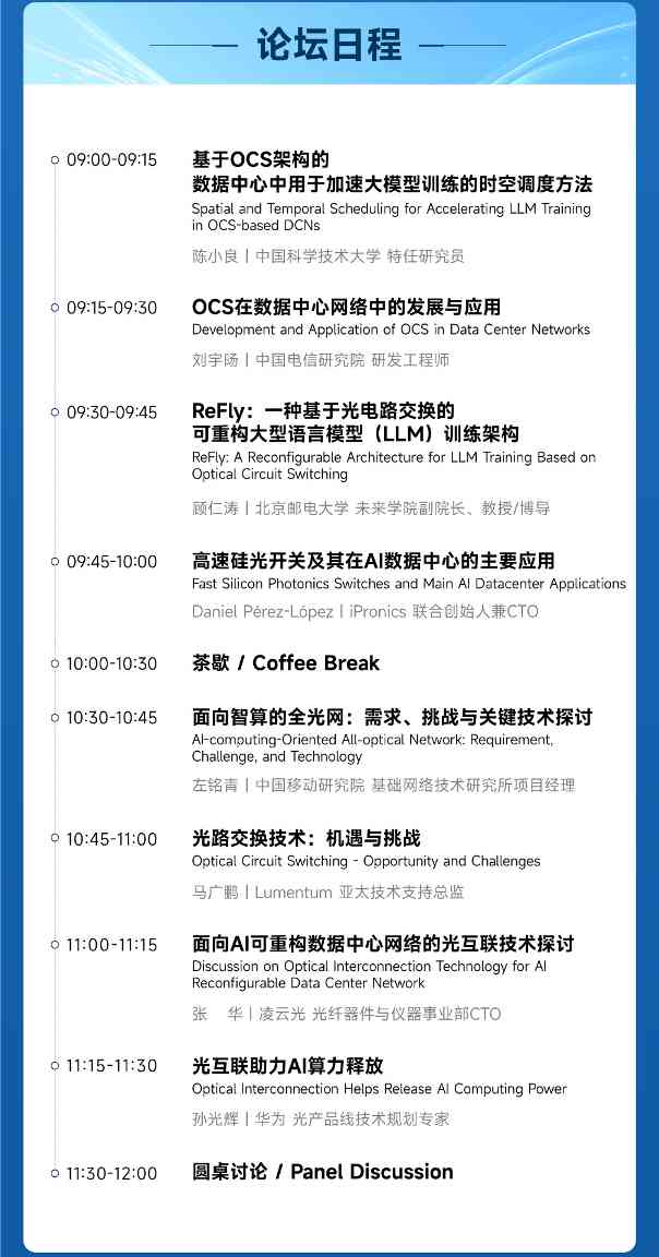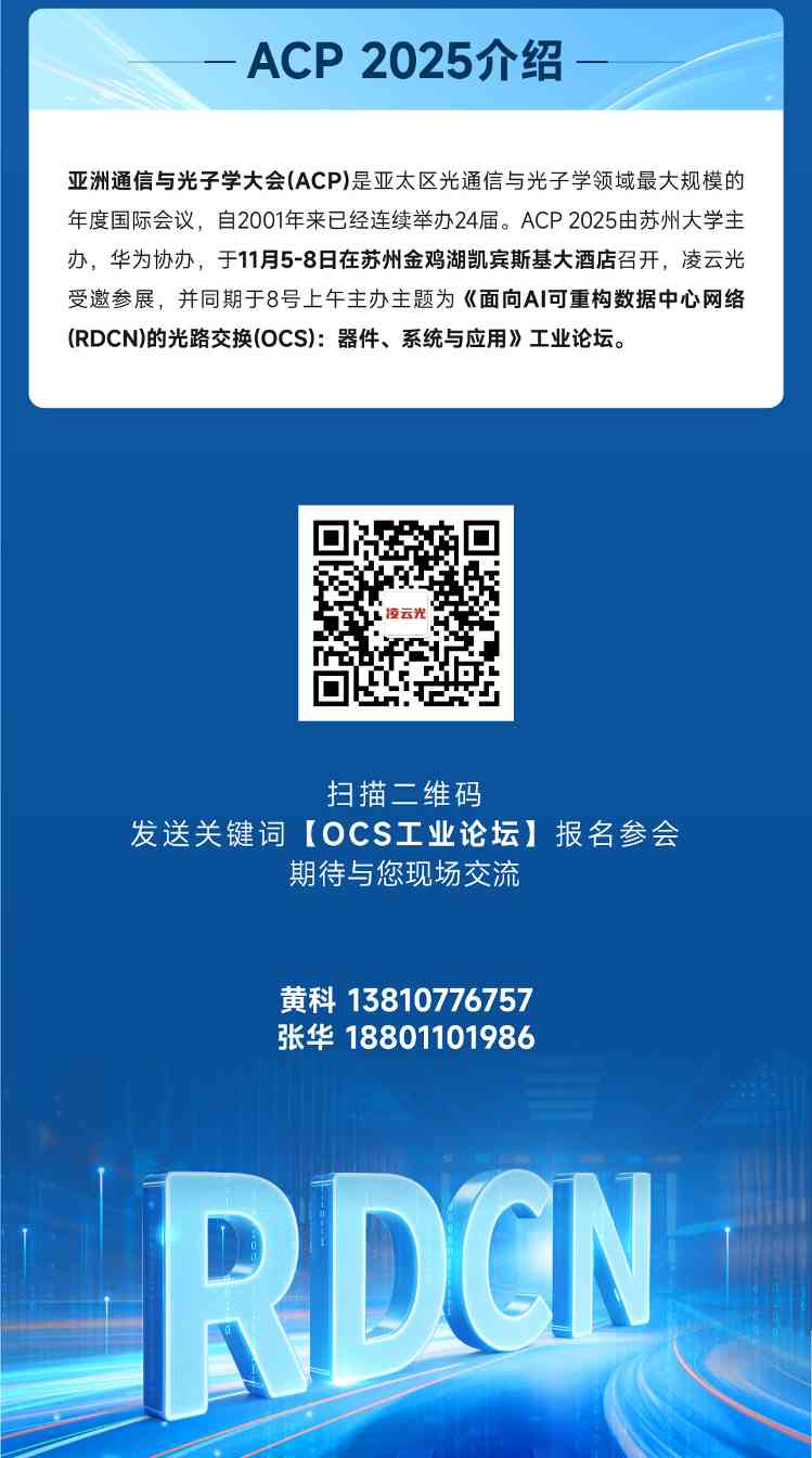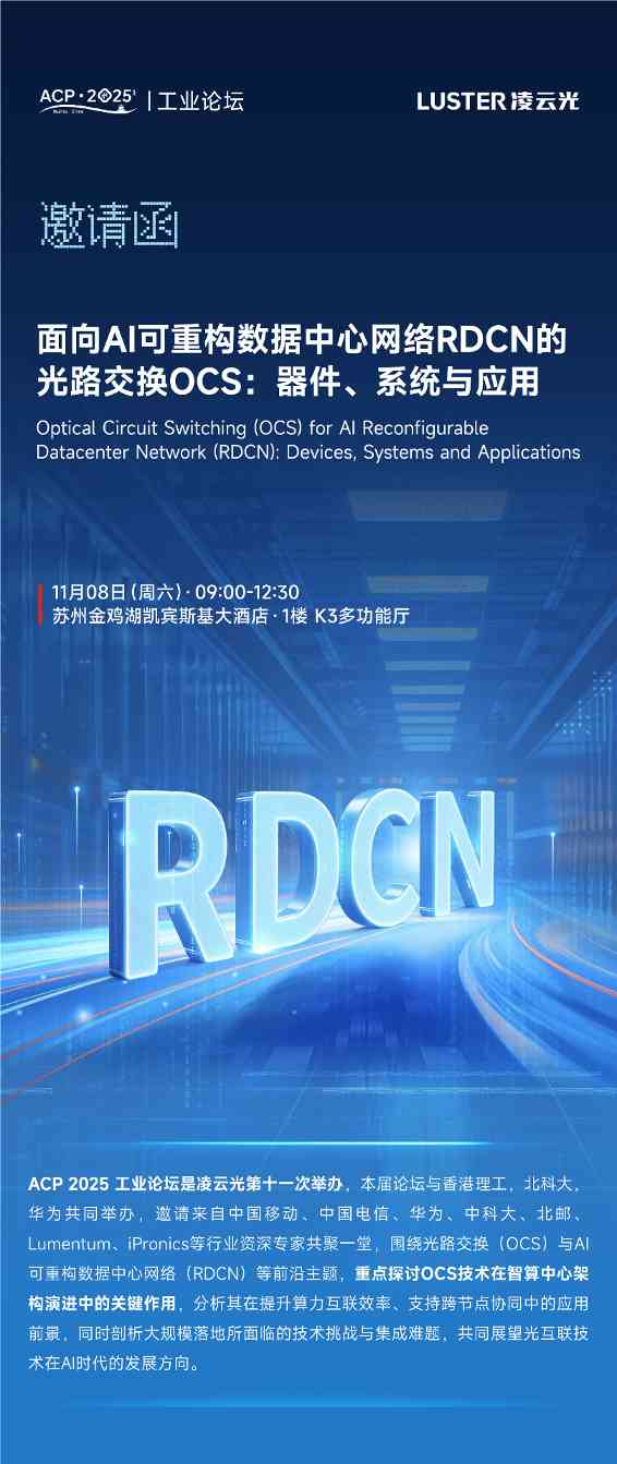 ACP 2025 工业论坛是凌云光第十一次举办,本届论坛与香港理工,北科大,华为共同举办,邀请来自中国移动、中国电信、华为、中科大、北邮Lumentum、iPronics等行业资深专家共聚一堂,围绕光路交换(OCS)与AI可重构数据中心网络(RDCN)等前沿主题,重点探讨OCS技术在智算中心架构演进中的关键作用,分析其在提升算力互联效率、支持跨节点协同中的应用前景,同时剖析大规模落地所面临的技术挑战与集成难题,共同展望光互联技术在AI时代的发展方向。