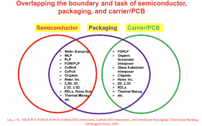 图2:现代先进封装如何在传统独立域之间创造显著重叠,展示WLP、PLP、FOWLP、FOPLP、CoWoS、CoPoS和Chiplet等技术跨越多个传统边界