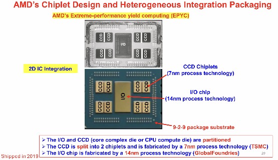 图6:AMD的2D Chiplet集成方法,其中I/O和核心复合管芯被分离并使用不同的工艺技术制造(I/O使用14nm,计算核心使用7nm),然后在共同基板上集成