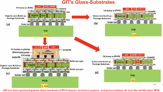图11:比较玻璃芯和有机芯构建基板,显示玻璃芯如何实现不同的集成方法,包括2.5D TSV-Interposer和直接芯片贴装