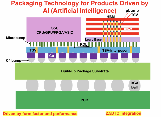 图7:2.5D集成的关键组件,包括TSV-Interposer、微凸点、C4凸点,以及逻辑和内存元件在共同Interposer基板上的排列