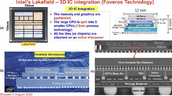3D集成代表空间高效封装的终极表达,其中Chiplet垂直堆叠以创建真正的三维系统。英特尔的Foveros技术和Lakefield处理器体现了这种方法,展示计算Chiplet如何堆叠在有源Interposer上以创建紧凑的高性能系统。