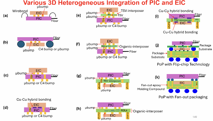 图15:集成光电子集成芯片(PIC)和电子集成线路(EIC)的不同方法,包括各种键合技术、Interposer方法和堆叠配置