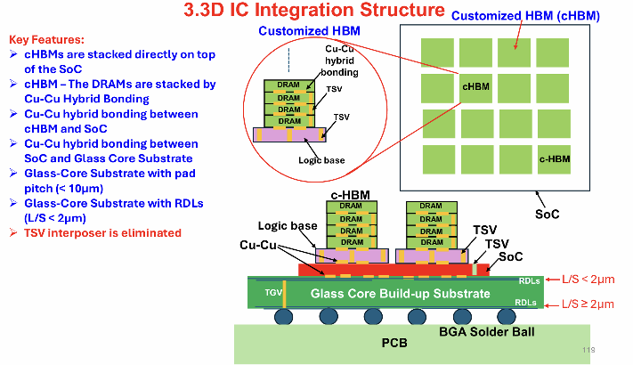 图17:定制HBM集成的结构,显示DRAM堆叠如何使用铜对铜混合键合直接键合到玻璃芯基板上的系统级芯片器件
