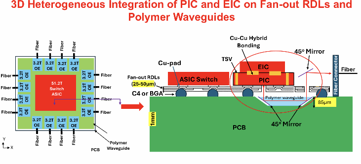 图16:使用嵌入式聚合物波导、45度反射镜和光电子技术与电子元件3D集成的先进光电共封装实现