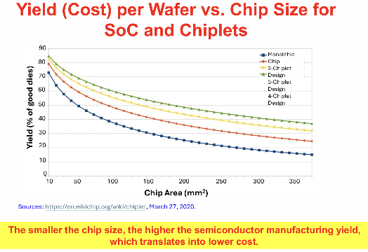 图5:随着芯片面积增加,单片设计的良率急剧下降,而基于Chiplet的方法通过使用更小的单独元件保持更高的良率