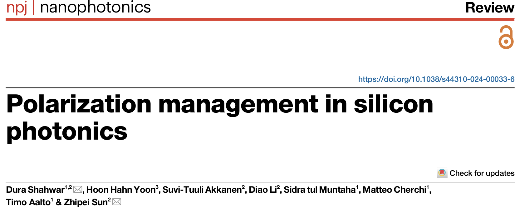 [1] D. Shahwar, H. H. Yoon, S.-T. Akkanen, D. Li, S. t. Muntaha, M. Cherchi, T. Aalto, and Z. Sun, "Polarization management in silicon photonics," npj Nanophotonics, vol. 1, no. 35, 2024, doi: 10.1038/s44310-024-00033-6.