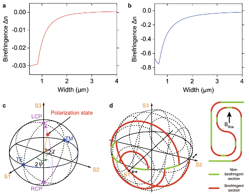 图2:偏振管理的基础物理概念,包括(a)3微米SOI平台的几何双折射特性,(b)亚微米SOI波导的双折射行为,(c)偏振状态在庞加莱球上的表示方法,(d)硅波导中法拉第旋转的庞加莱球表示