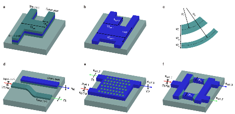 图3:多种片上偏振分束器的结构设计,展示了(a)对称MMI型偏振分束器,(b)级联MMI型偏振分束器,(c)弯曲定向耦合器设计,(d)定向耦合器型偏振分束器,(e)光子晶体型偏振分束器,(f)基于马赫-曾德干涉仪的偏振分离器