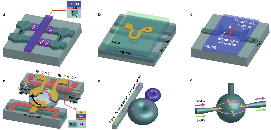 图5:片上非互易器件的多种实现方案,展示(a)基于马赫-曾德干涉仪的隔离器/环行器结构,(b)集成铈掺杂钇铁石榴石的隔离器,(c)直接键合技术实现的结构,(d)声光调制型隔离器,(e)基于受激布里渊散射的隔离器,(f)光机械非互易器件