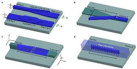 图4:片上偏振旋转器的各种实现方案,包括(a)模式演化和模式耦合型旋转器的基本结构对比,(b)基于模式演化的偏振耦合器设计,(c)基于绝热模式转换的螺旋波导结构,(d)采用亚波长光栅结构的偏振旋转器