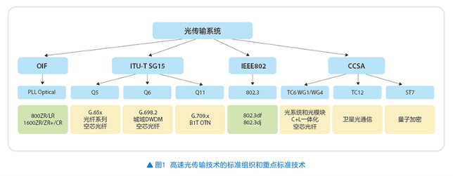 高速光传输技术涉及的标准组织包括ITU-T SG15、OIF、IEEE802.3以及国内CCSA,各标准组织和重点标准技术如图1所示。
